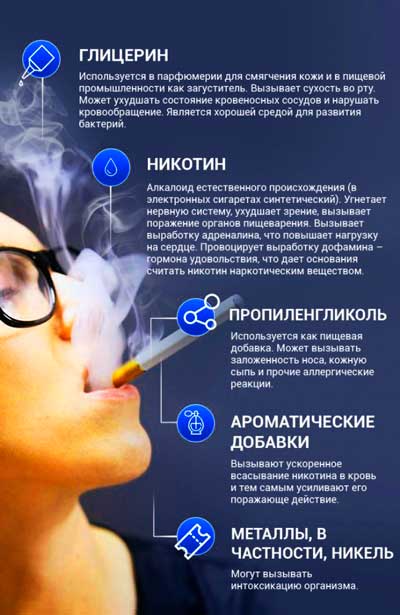 Но так ли уж безобидна электронная сигарета, как кажется на первый взгляд? Основной компонент электронной сигареты – жидкость, которая приобретается отдельно и имеет различные ароматические добавки (ваниль, кофе и пр.). Она состоит из основы (глицерин и пропиленгликоль, смешанные в разных дозировках), ароматизатора и никотина. Впрочем, последний может и вообще отсутствовать.