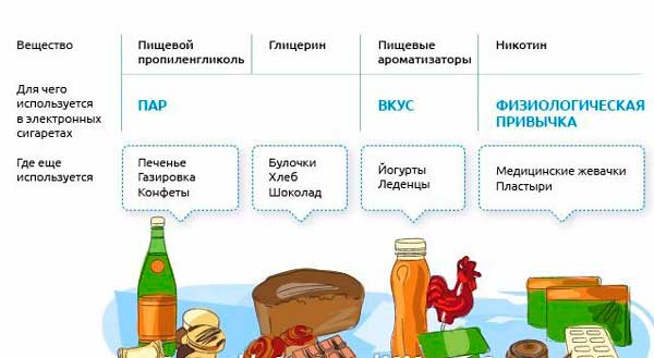 Глицерин. Составляет основу жидкостного наполнителя в устройстве для курения. Роль глицерина в электронных сигаретах состоит в том, чтобы делать жидкость более однородной массой, придает ей приятный вкус во время выпаривания. Это вещество используется во многих продуктах пищевой и химической промышленности.