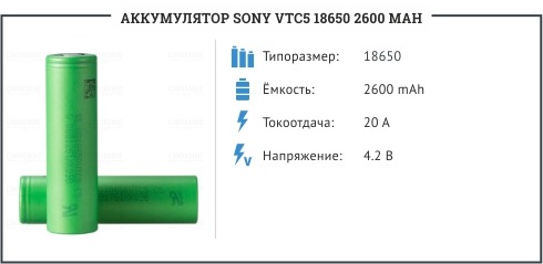 Аккумулятор SONY VTC5 18650 2600 MAH – высокотоковый аккумулятор, который предназначен для использования с современными электронными сигаретами. АКБ подходит для модов, поддерживающих батареи формата 18650. Производитель рекомендует эксплуатировать аккумулятор с устройствами до 75 Вт.