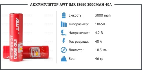 Аккумулятор AWT IMR 18650 3000MAH 40A – высокотоковая батарея, обладающая емкостью в 3000 mAh. Продукт разработан компанией Panasonic, качество товаров которой не нуждается в представлении. Гаджет подойдет для устройств, работающих на высокой мощности. АКБ обладает низким уровнем саморазряда, а потому прослужит вам на протяжении длительного времени.