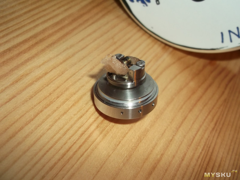 К минусам отнесу два момента, ужасные два комплектных дриптипа, а так же слабый о-ринг на регулировке кольца затяжки. Смущает отсутствие ваты и заранее намотанных спиралей. Еще хотелось бы видеть доп.отверстие, с затяжкой чуть свободнее, но при желании можно рассверлить базу и само кольцо. На кольце регулировки не хватает накатки, иногда пальцы проскальзывают.