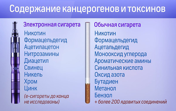 - результаты химического анализа пара выявили содержание токсичных веществ, канцерогенов и тяжёлых металлов (пропиленоксид, акролеин, формальцельдегид, ацетилацетон, нитрозамины, свинец, никель, хром, цинк и др.);