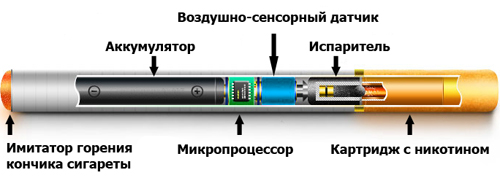 Состоят все электронные сигареты из исполнительного механизма, микропроцессора, картриджа, воздушно-сенсорного датчика, имитатора горения (светодиод на конце аккумулятора) и аккумулятора, расположенных в корпусе, выполненных как в виде различных сигарет, так и в виде курительных трубок.