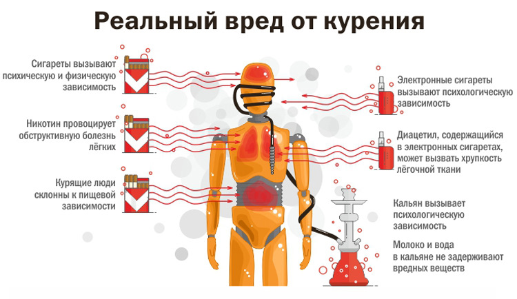 – На одном уровне. Почему на одном? Потому что количество принимаемого дыма одинаково что из сигареты, что из электронной сигареты, что от кальяна. Вред от них одинаковый.